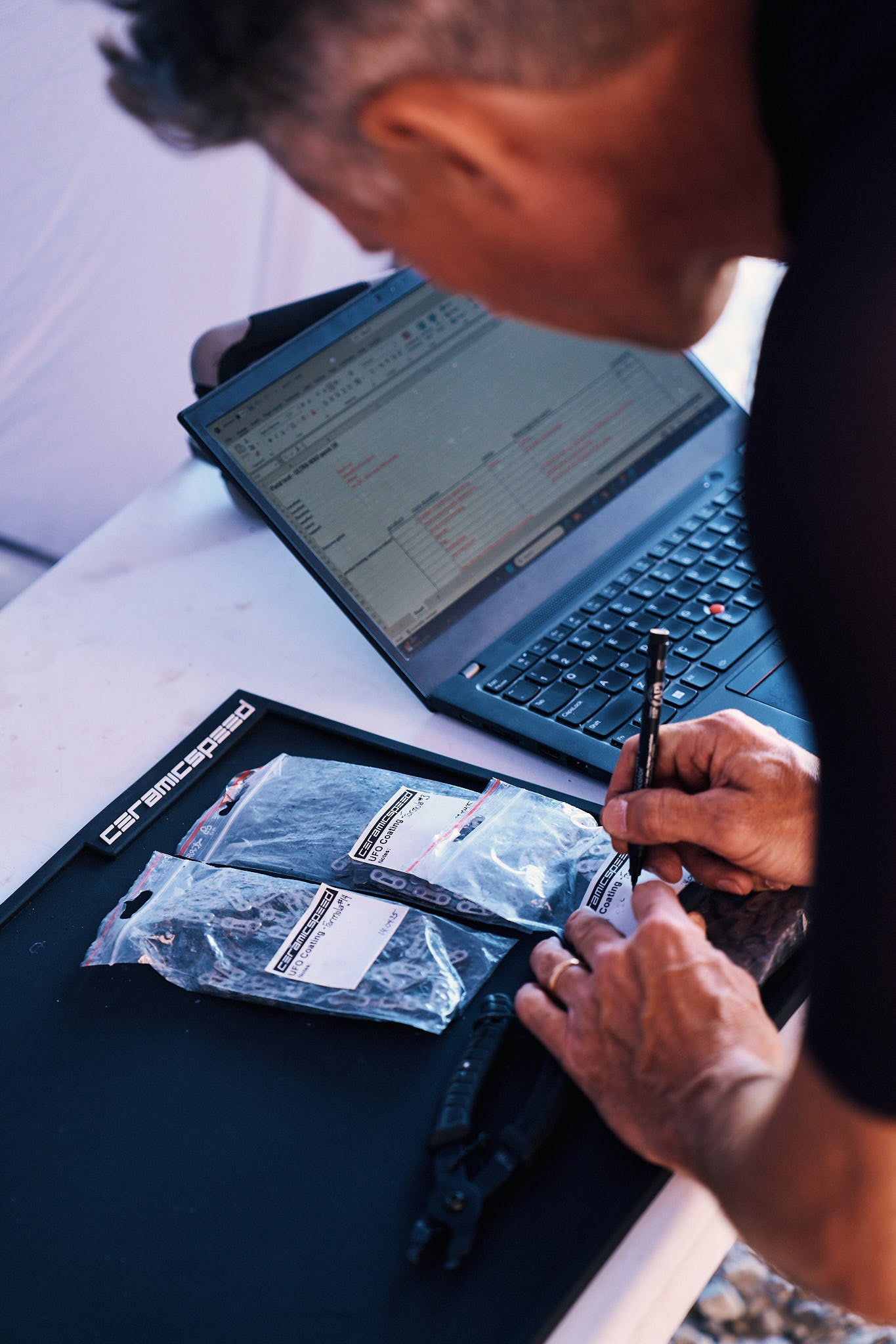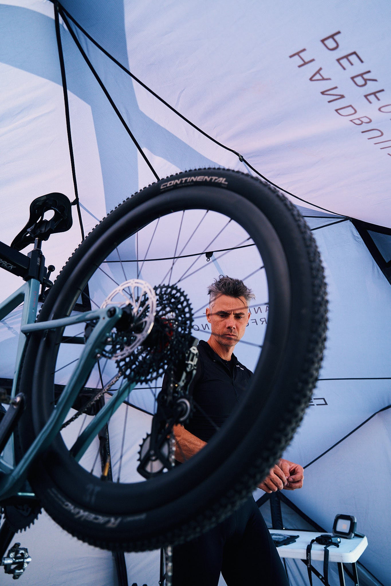 The open interior space of our new tent functioned exactly as intended, allowing our crew to move freely within, while having ample room to place a bike stand for switching between chains and to create a makeshift field office to keep track of important findings.