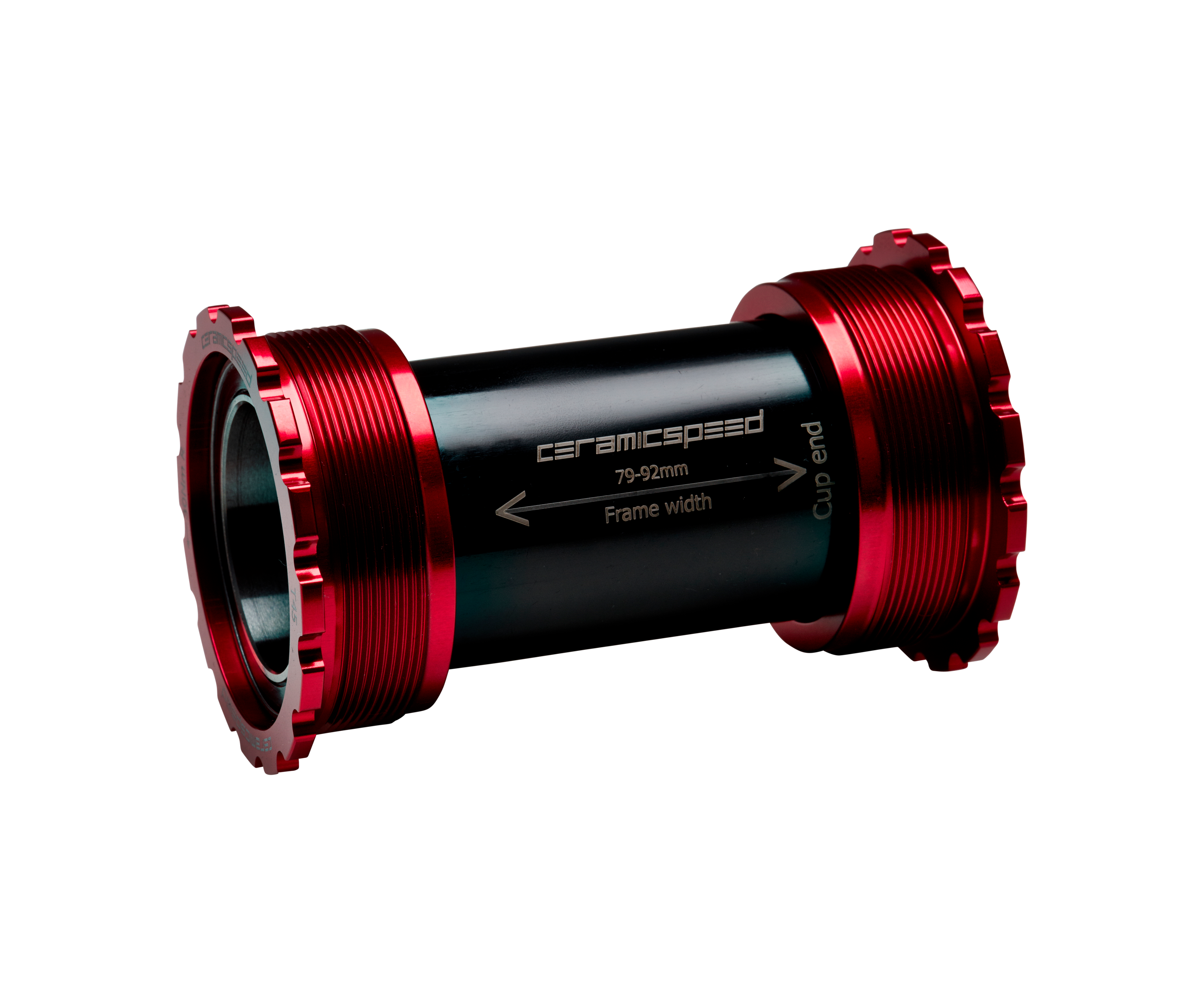 The cups have CeramicSpeed bearings pressed in, and then are threaded into the bb. There are two bearing options. The Standard Bearing has CeramicSpeed Balls and hardened-steel races. The Coated Bearing has the same balls running on a 3-micron thick coating placed on top of those hardened-steel races, which makes them faster and more durable.
