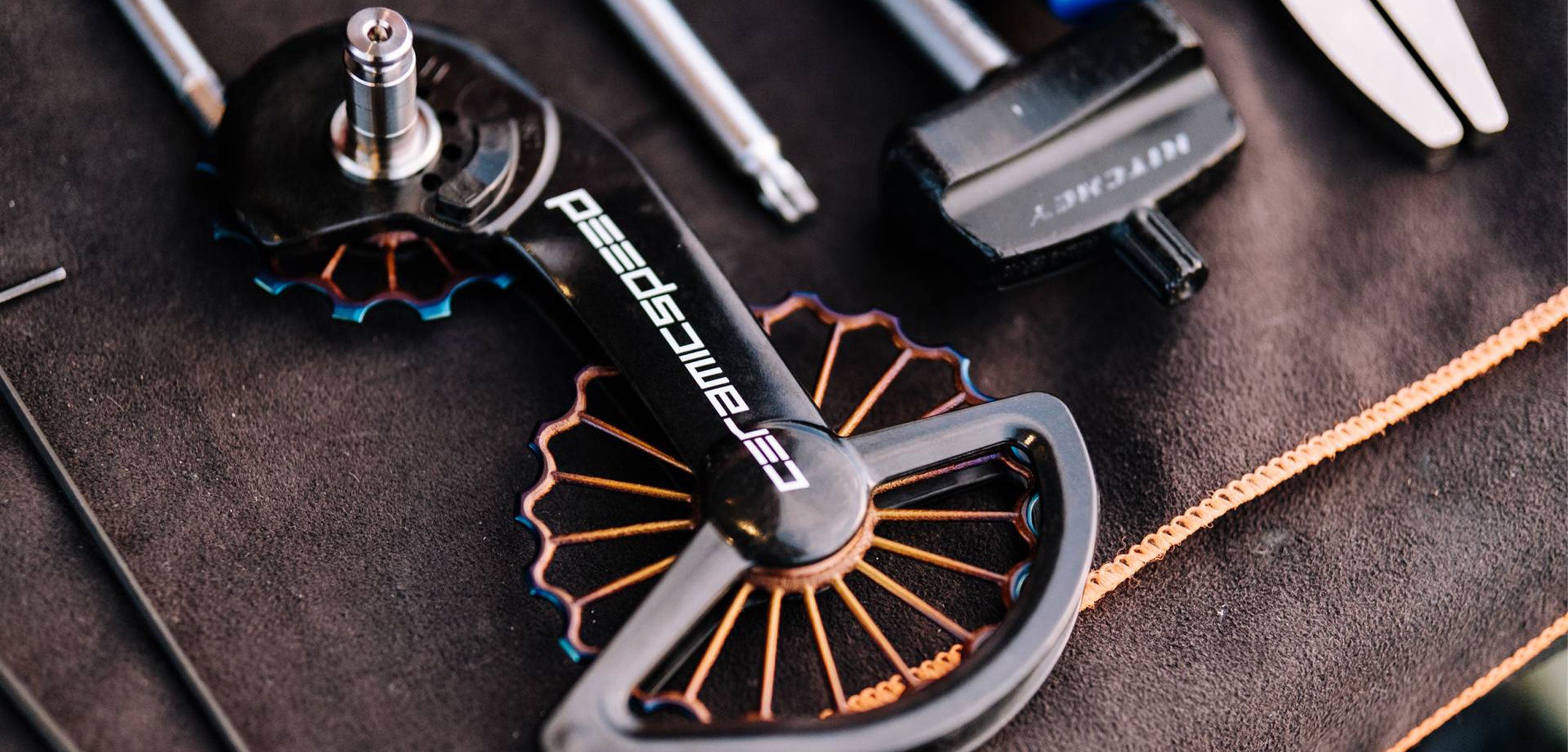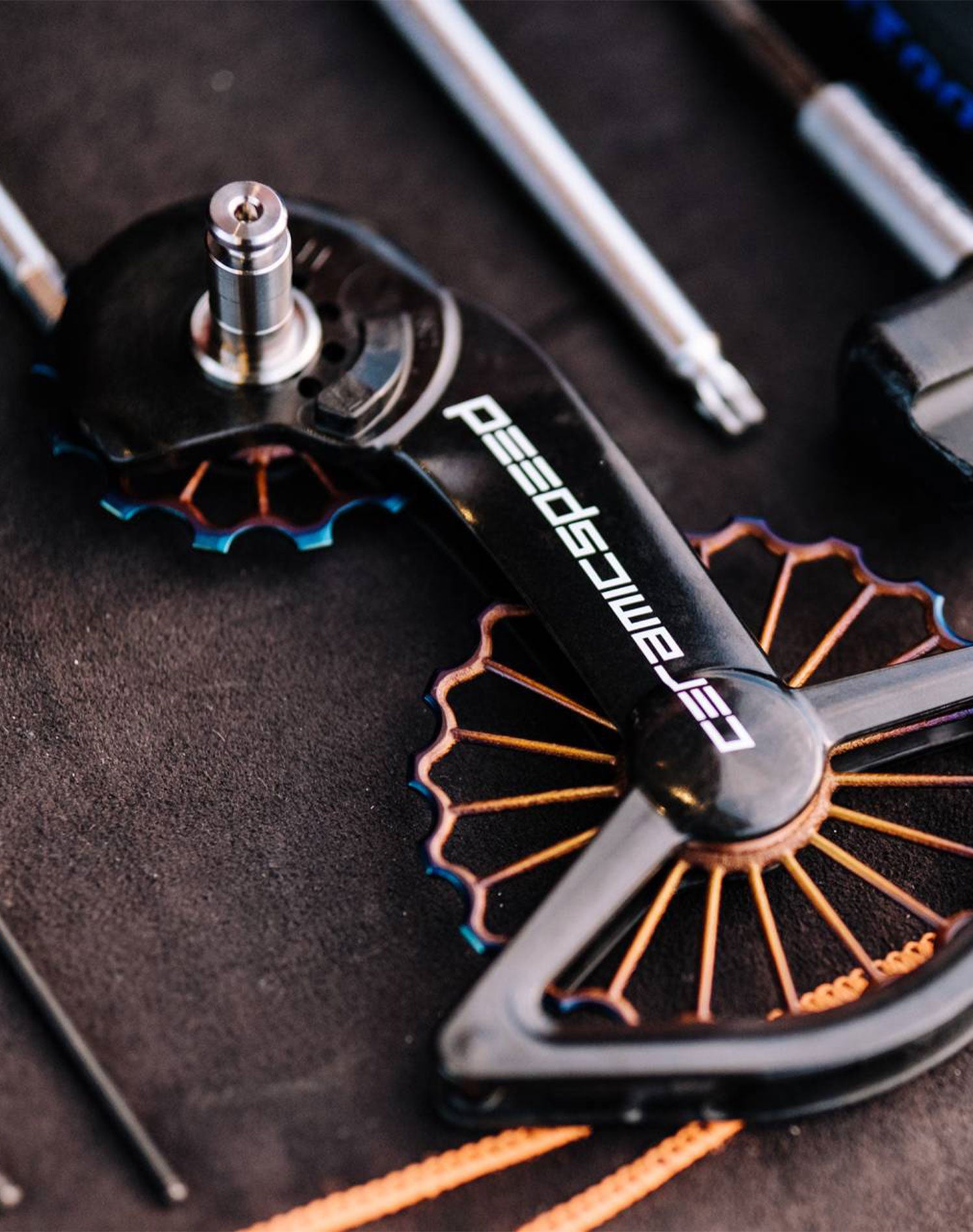 This 3D-Printed titanium version comes with CeramicSpeed Coated Bearings mounted in upper and lower pulleys. This OSPW System is also compatible with the 2020 11 speed SRAM Red eTap derailleur featuring a clutch.